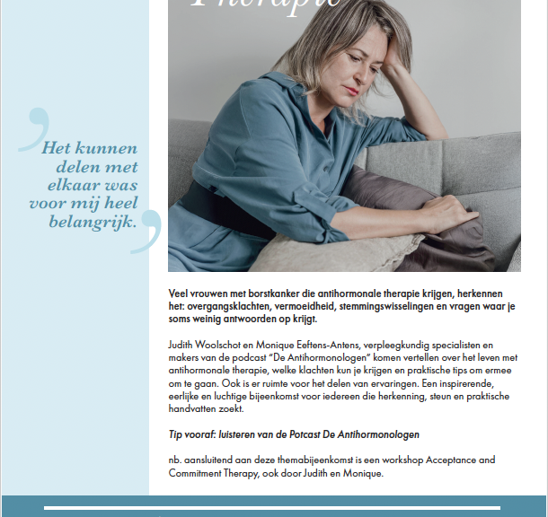 Veel vrouwen met borstkanker die antihormonale therapie krijgen, herkennen het: overgangsklachten, vermoeidheid, stemmingswisselingen en vragen…