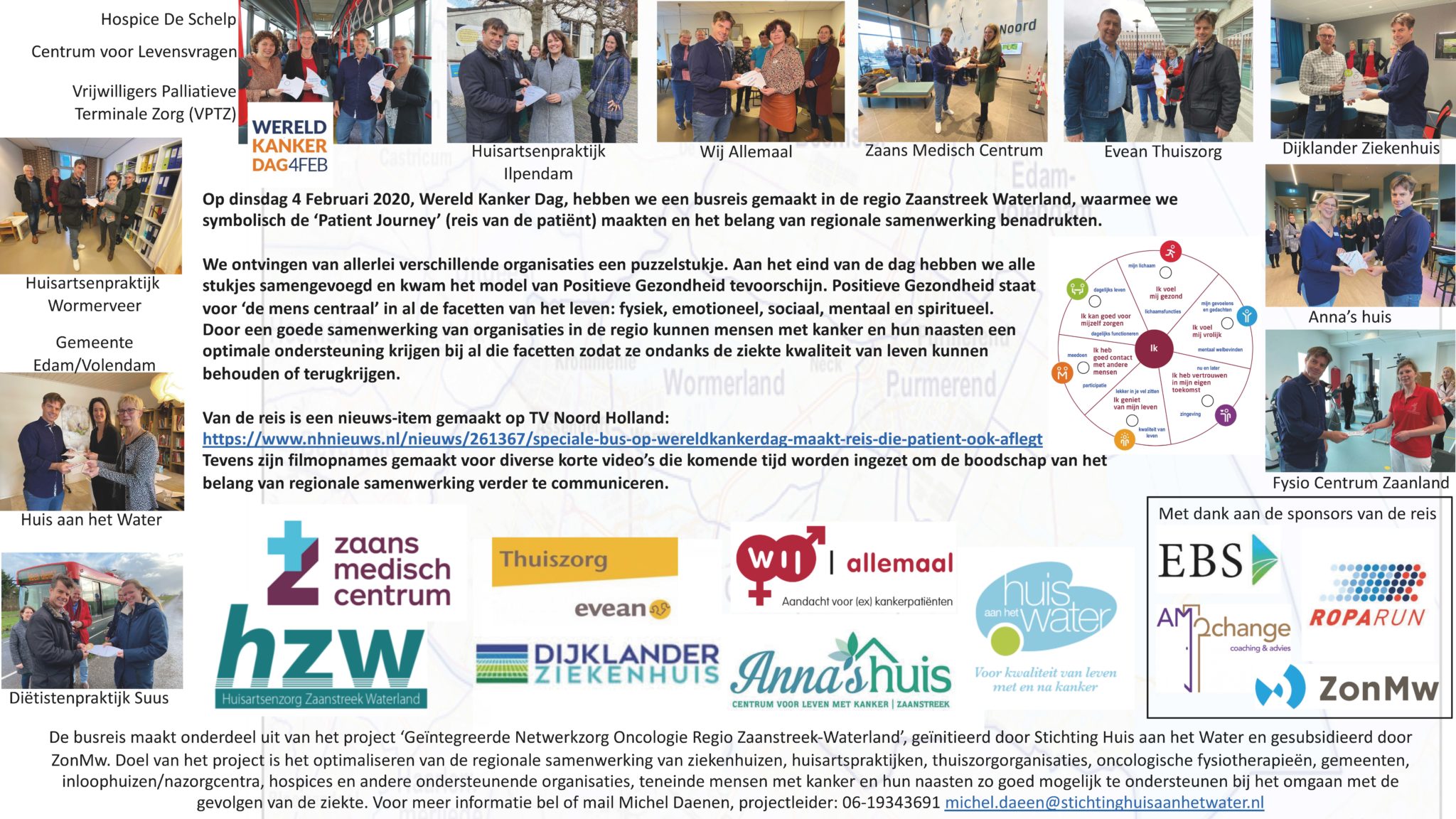 Gisteren hebben we met een bus door de regio gereden en hebben we puzzelstukjes verzameld van Positieve Gezondheid. Het was een leuke en ook intensieve reis, compleet met zingen in de bus, stortregens en een regenboog onderweg. Dank aan alle organisaties die ons gastvrij ontvingen en aan de passagiers van de bus voor hun geduld tijdens de vele filmopnames. Het was een geslaagde ‘Patiënt Journey’ met een fijne sfeer en saamhorigheid. Gisteravond was er al een kort item over de reis op TV Noord Holland, te vinden via https://www.nhnieuws.nl/nieuws/261367/speciale-bus-op-wereldkankerdag-maakt-reis-die-patient-ook-aflegt